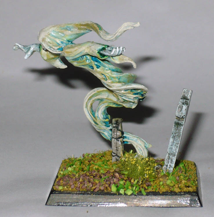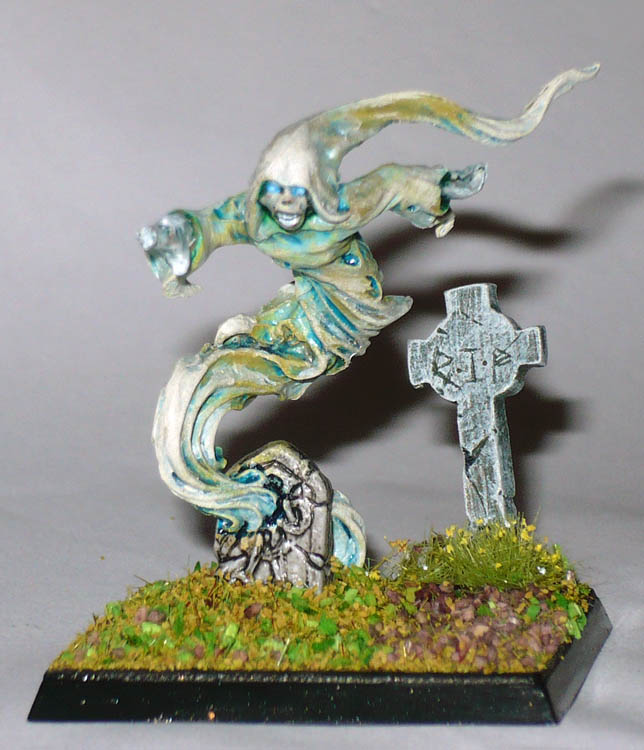 The Ghost, on a 40×40 base with a metal tombstone (don’t know the make, it was found among a lot of old unpainted scenery stuff I have in a box under the cellar stairs.)