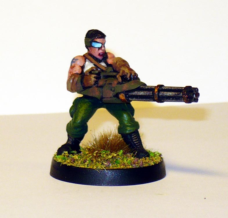 This was a leftover mini from the olden days when I painted a squad of Viridian Marines for use as Imperial Guard Catachans in 40k. The relative simple green trousers and white singlet is the same colours I used for them.