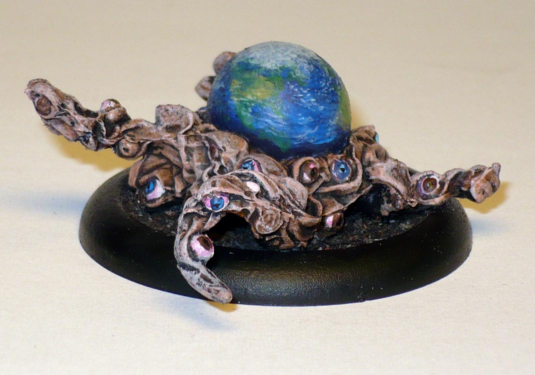 For some obscure reason the model “77115 Shoggoth” by Reaper features a big globe in it’s middle, as if it is on it’s back. It’s as if the sculptor started with a marble and tacked on some tenatcles with eyes. Don’t get me wrong, it is a nice, Lovecraftian model, but i find the marble a bit jarring. It is too large, to perfectly spherical. It simply does not seem to be a part of the creature, and I certainly do not think of Shoggoths when I see it. (if there had been several such globes of varying size held together with amorphous ectoplasm, well, YES! But just one is strange. I see most people paint them as large central eyes.