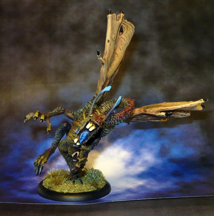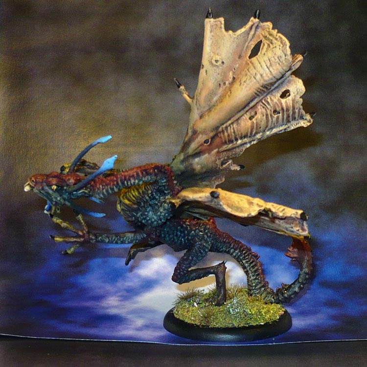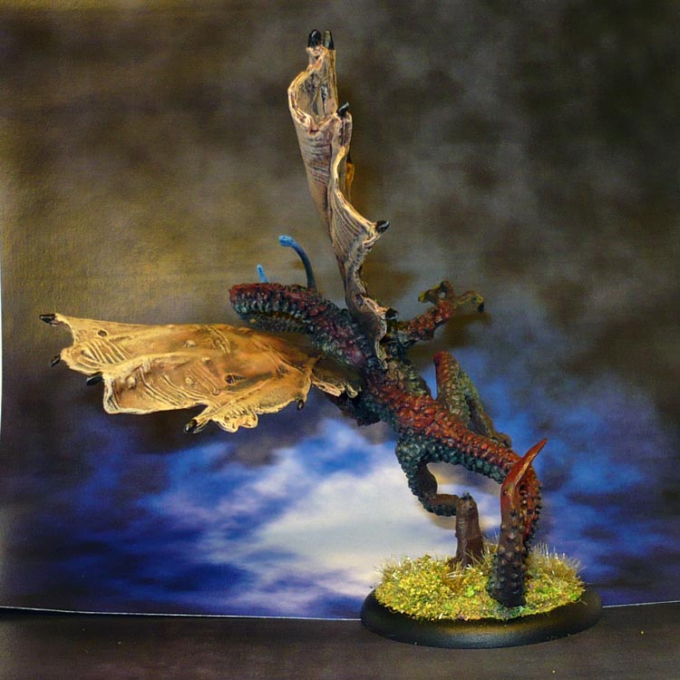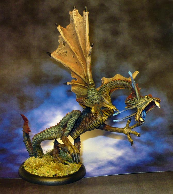This Jabberwock was all bowled over and in a sorry state before I inserted metal pins all the way up the leg from the base and again through the lower calf (the bit running parallell to the base). And the base itself needed some serious weighing down to keep from tipping over all the time. Good thing I had those old Heavy Metal shields from back in the day lying about.