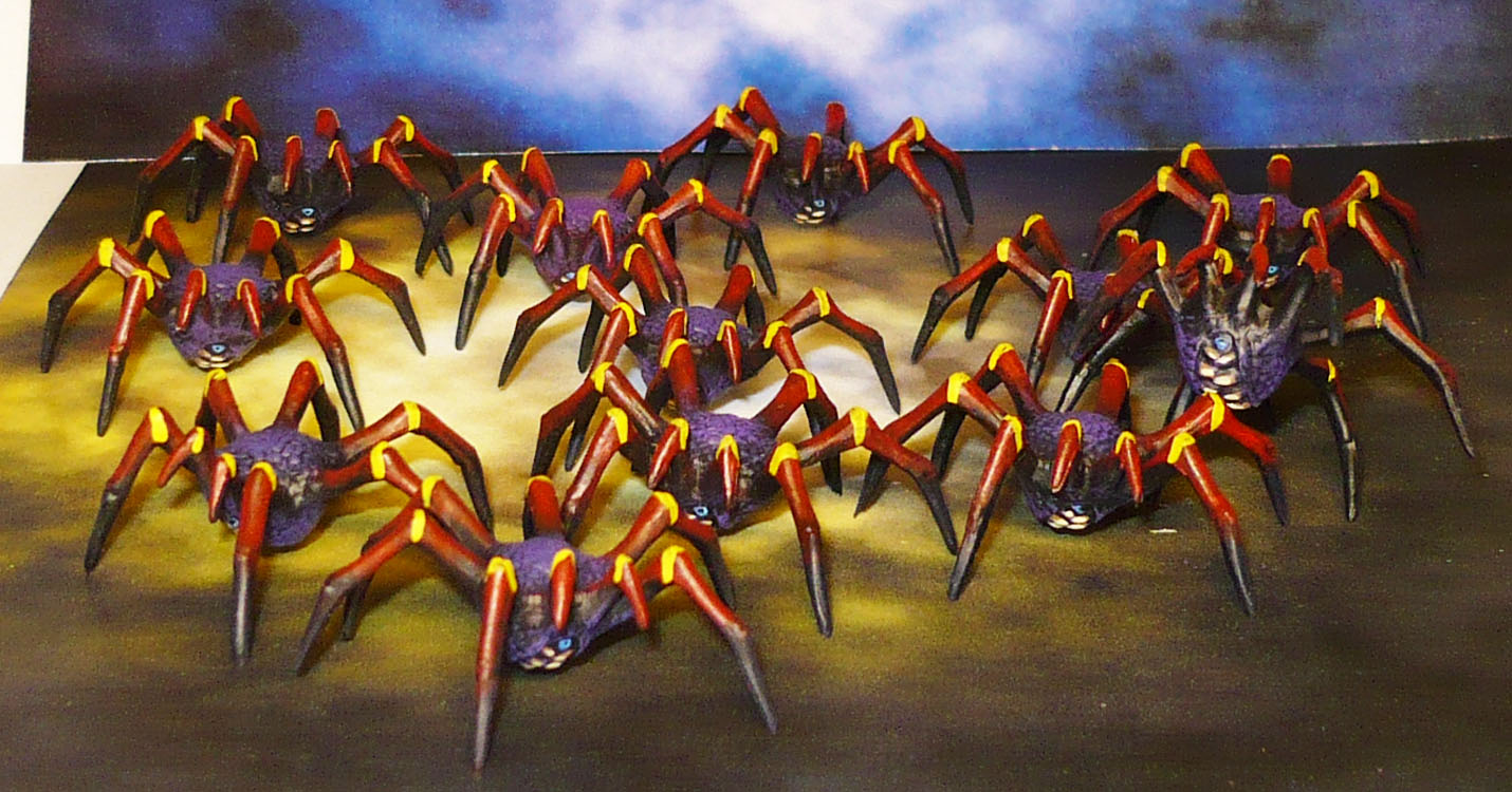 I have been debating myself about how to paint these, and settled for a tarantula-like scheme. Sinister and simple, but with a splash of colour. Also, I chose to paint the frontmost tooth-lump as a single baleful eye just in the corner of the maw. Quite unsettling.