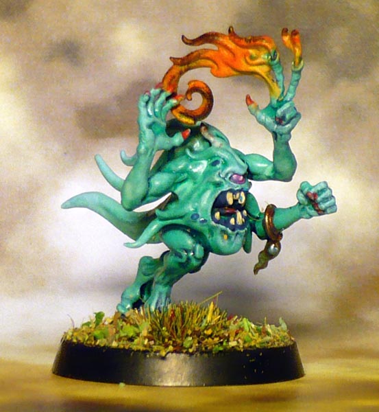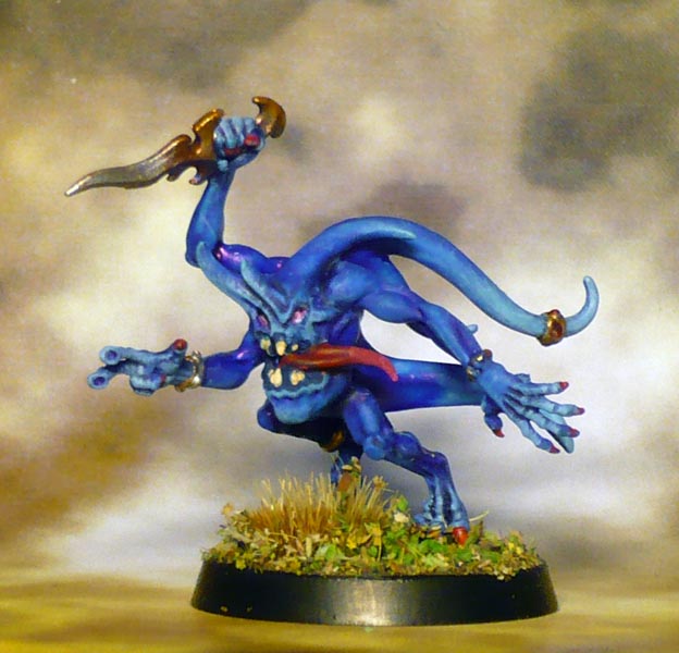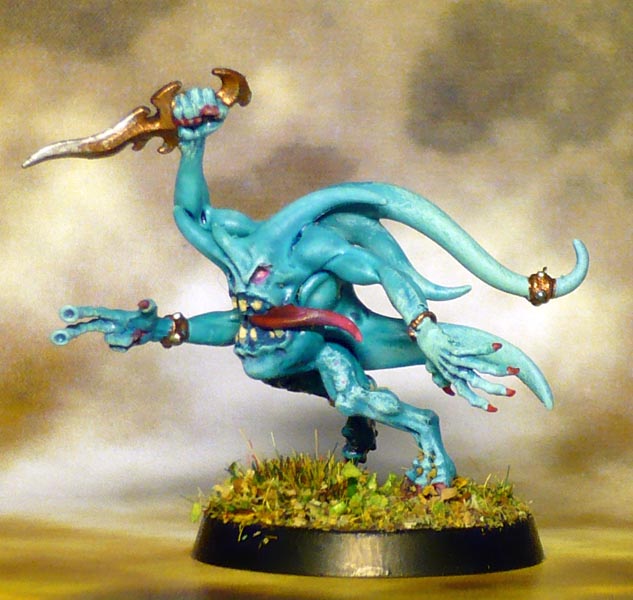 Talk about your radical re-designs. These are significantly different from the original oldhammer ones I recently painted up. They are nice on their own terms, and certainly have more movement to them. But they seem less…fun? The originals were all grinning happy pink horrrors, and sad depressed-looking blue horrors. This bipolar-aspect to them seems to have been completely lost.