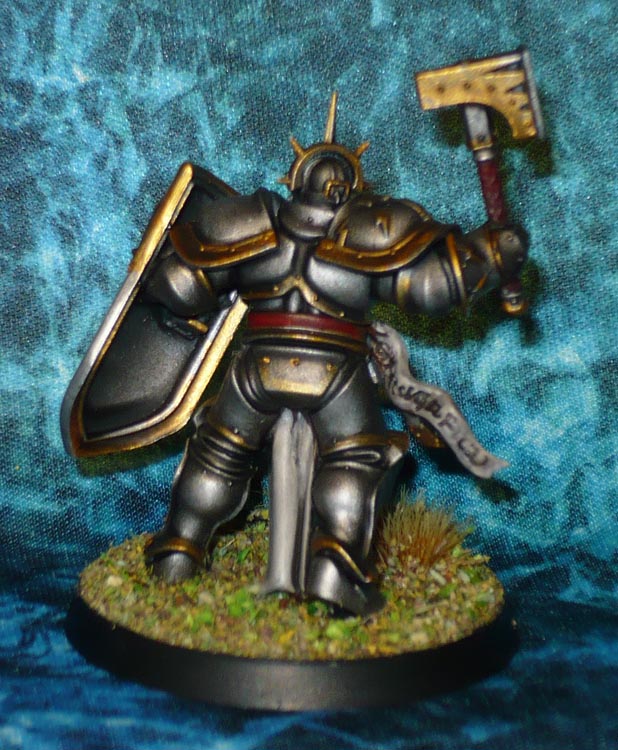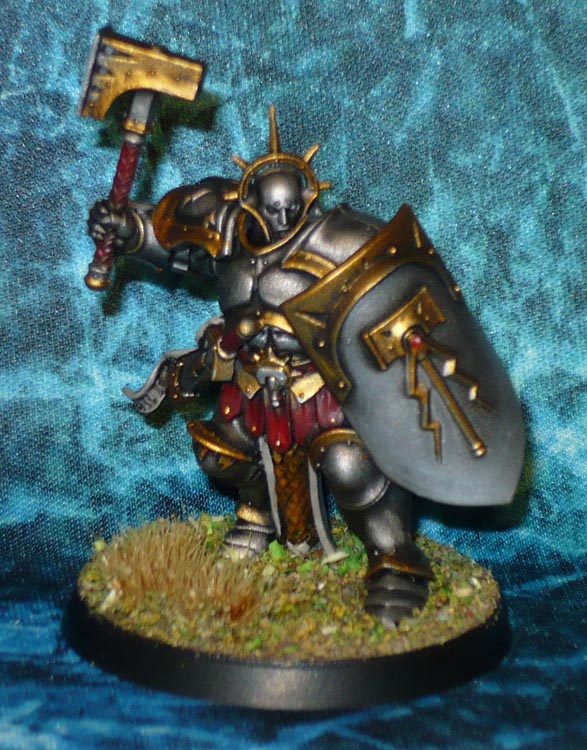 I basecoated with Army Painter Plate Mail primer spray. After that, glorious gold detailing and a couple other colours before a controlled wash with Army Painter Dark Tone Quickshade Ink (the dropper bottle version, not the dip) and a little highlighting with plate mail and shining silver.