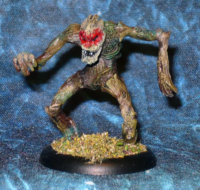 Some sort of corrupted, chaos or just plain evil man-sized treeman or dryad (not sure what they were called back then, or even now.) I opted to not go for the “Snow White Black Forest” look and rather indicate the foulness of this evil Groot with a strong, reddish glow around the black eyes and the toothy, leering smirk.