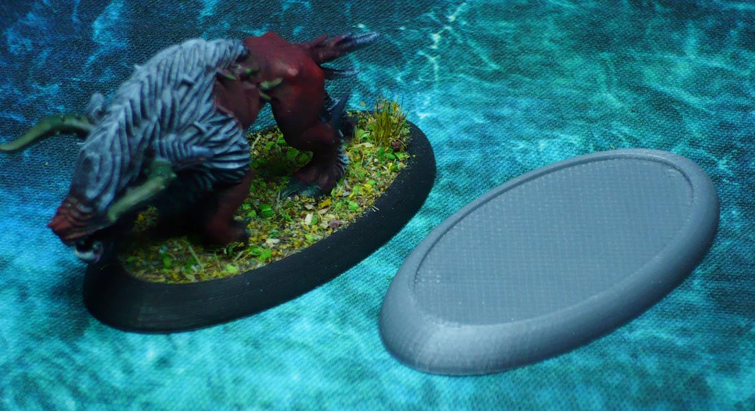 Voila! One 50mm x25mm oval lipped base. That’s the same footprint as a cavalry base. I had to change all three dimensions to make this, as the original model was too tall. But it turned out all right. And is easily resized for other dimensions as well. So now I can get the best of two worlds, both my preferred, esthetically pleasing chamfered base for individual viewing and skirmish game enjoyment, and backwards warhammer fantasy / kings of war compatibility for practical mass battle game functionality. Just stick them on a movement tray and off we go!