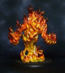 In the end I decided to forego the translucency altogether and just paint it like a proper fire, starting with basecoating it entirely white.