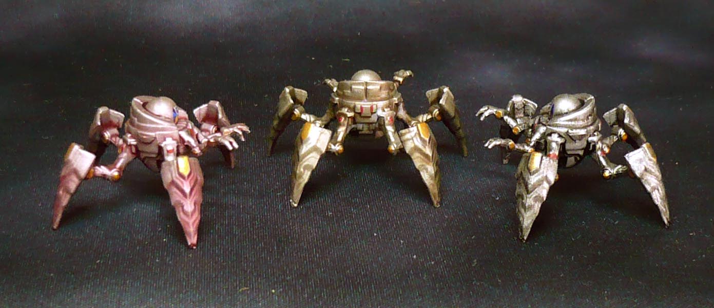 When dry, Eyes in bright blue then with a blue ink wash. Dotted some gold paint on protruding studs and bits, with some red and green on the front panel. Ready for action!