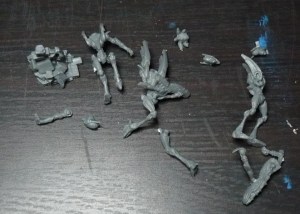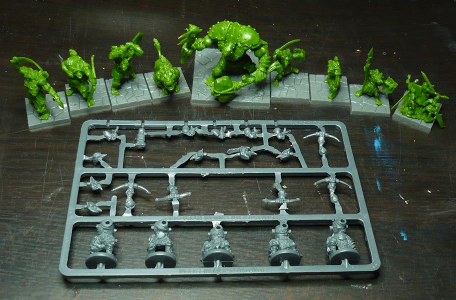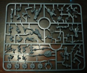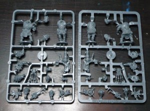 5 KoW Goblin Spitters. It looks like something in the middle there is missing, but some Google-Fu shows it is just some more sprue that has come off. These minis are infamously soft in the details. Not good. Luckily this is the only sprue of this generation of bad quality hard plastics (consists of Basilean men at arms and all Goblins -to be avoided unless REALLY cheap!) included. And incidentially the only KoW-minis in the box I do not already own some of.