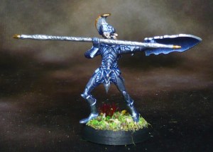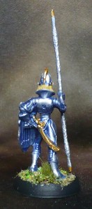A drybrush plus some hightlighting here and there with Army Painter Shining Silver. The gold bits are Vallejo Glorious Gold. The Shield and spear needed two coats of both silver and gold to cover the blue properly.
