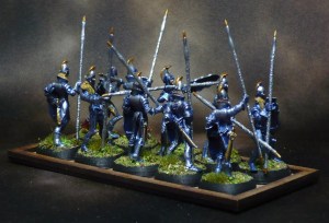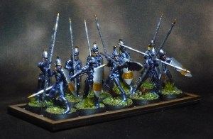 I think I will be doing the 20 bowmen in a similar style, but with reversed colours on the shields and weapons. I tried drybrushing a bowmen with gold, but that turned out bad. I think I will do silver like the above.