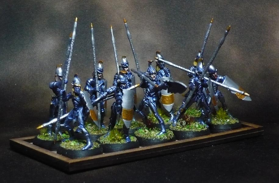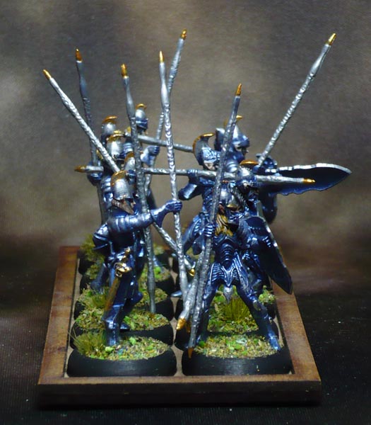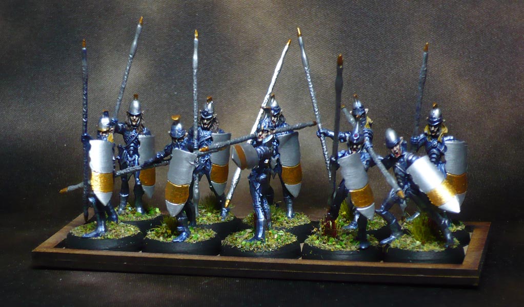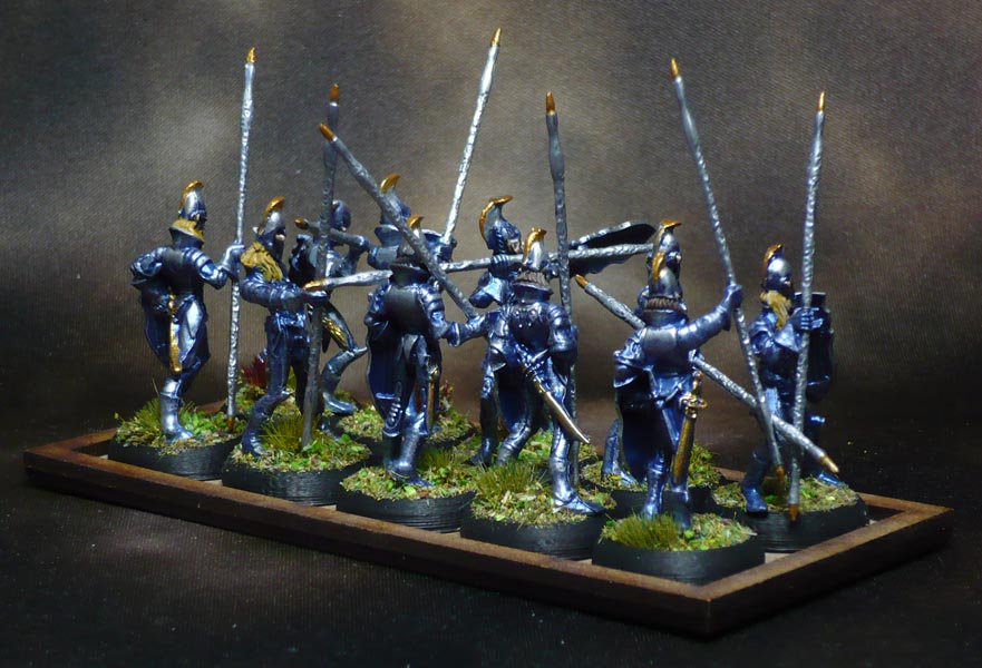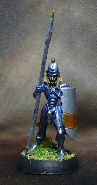 A drybrush plus some hightlighting here and there with Army Painter Shining Silver. The gold bits are Vallejo Glorious Gold. The Shield and spear needed two coats of both silver and gold to cover the blue properly.