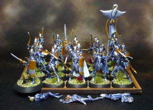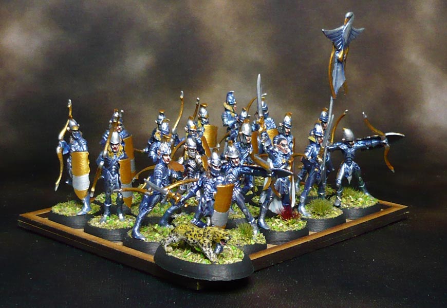 All I did differently from the spearmen was to reverse the colours on the shields, and do the bows in mainly gold.