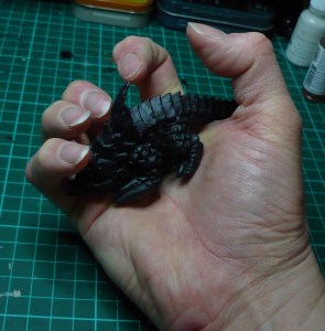 I mixed some heavy metal with the gold to create a highlight color, which I dabbed on the tips of the claws. I also tried to do the teeth in gold with the edge of a fingernail, but this did not turn out too well.