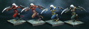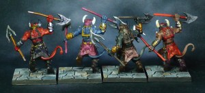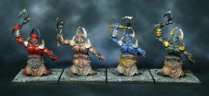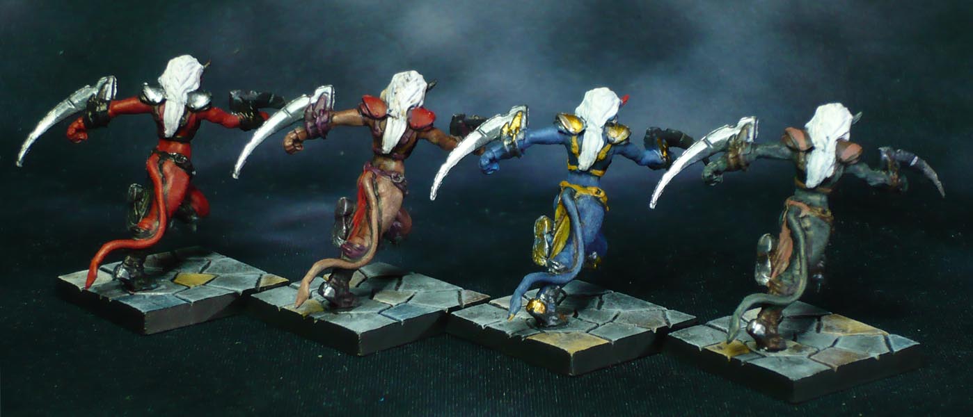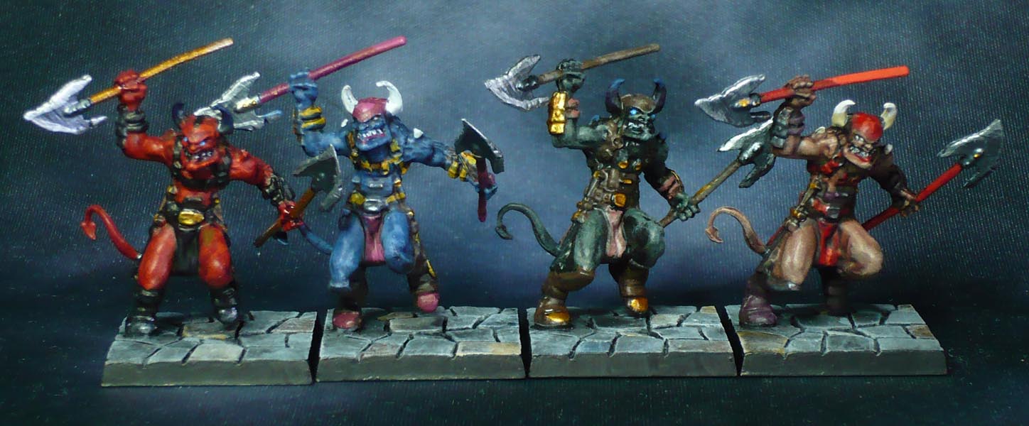 I do not generally like painting identical models identically, so I chose to do each set in a different colour scheme, from classic devil red via fleshtones to dark green and blue, with the Ifriiti and Hellhounds done separately.