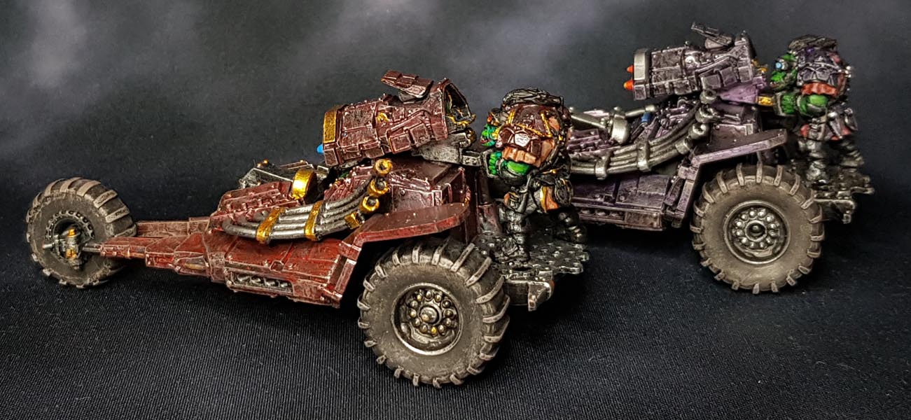 Not too much time dedicated to painting anything this week, but I did manage to get the vehicles from the Bobbybox done. These were all from Warpath, and included an old school Orx Raptor trike and three new-school (is that even an expression?) Veermyn Tunnel Runner monowheel-things.