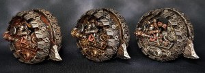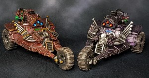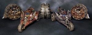 I painted them by undercoating black, and drybrushing a series of different metallics before dotting in details. The Raptors also got coloured ink washes to add some colour to their main bodies. This is a very quick way to do such vehicles and I did not want to spend too much time on these so I kept the weathering to a simple drybrush with earth brown. Which is more effective than it sounds, really.