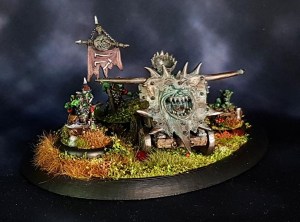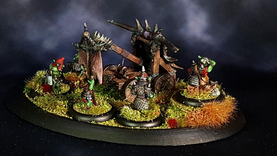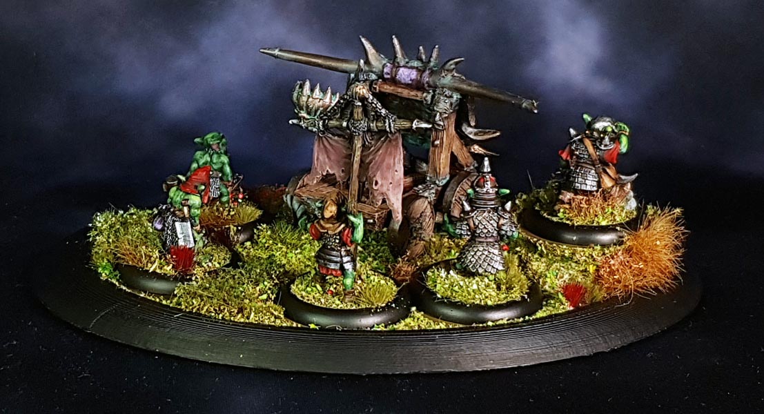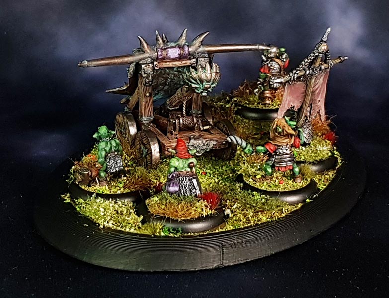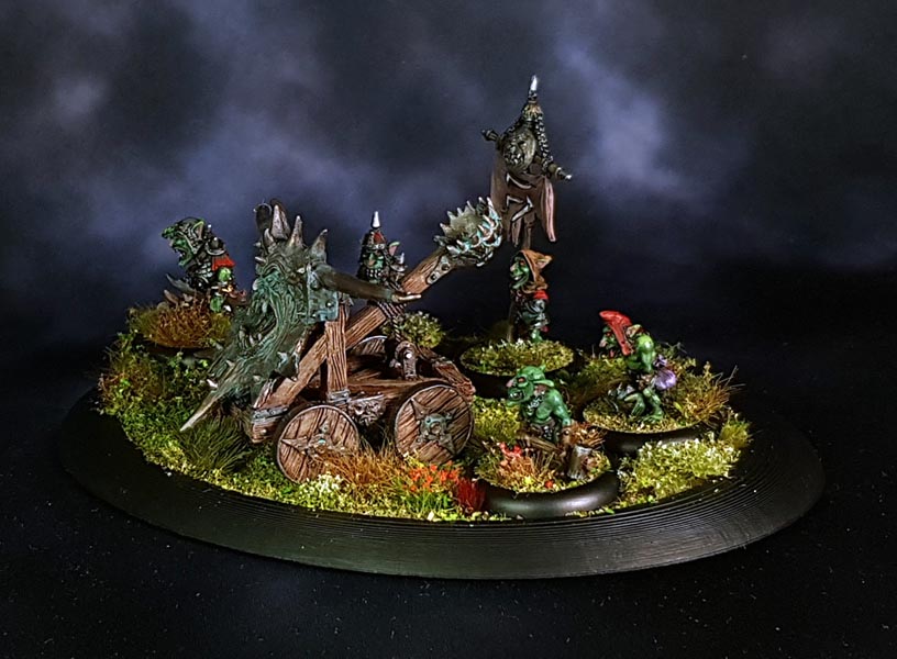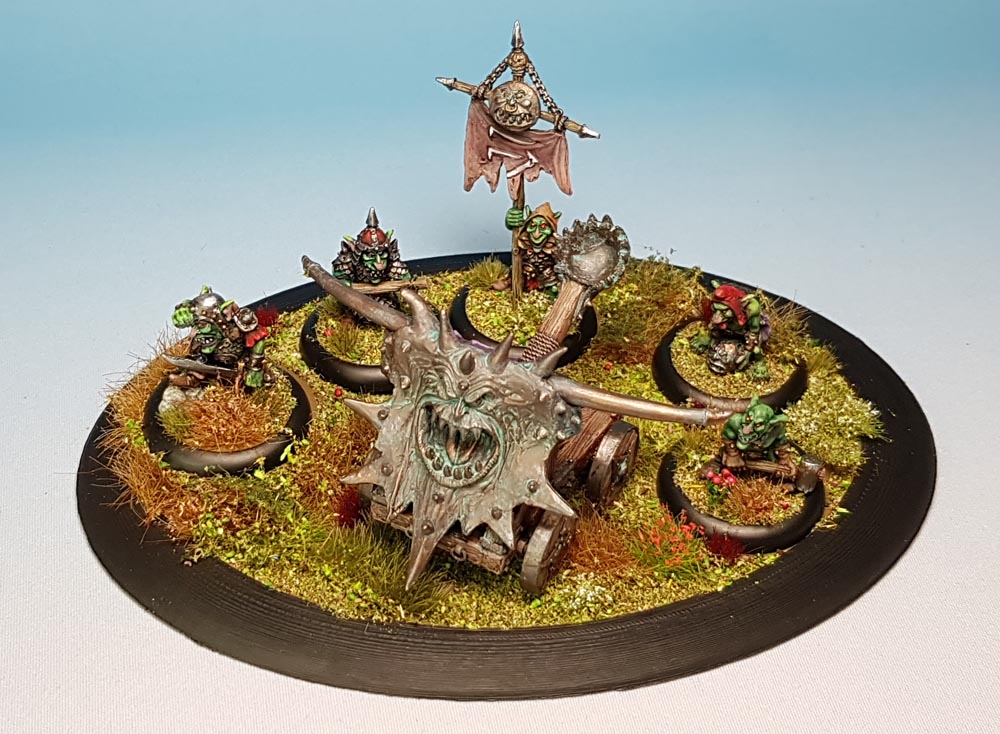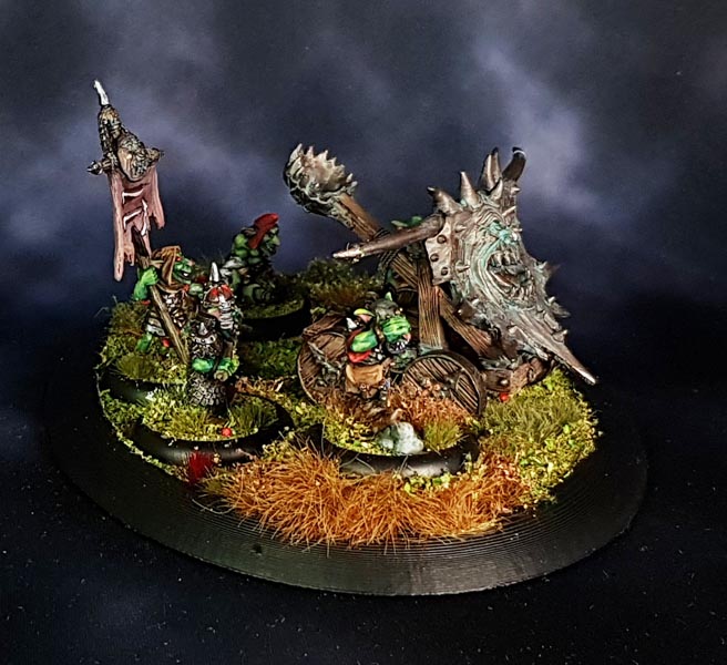 After painting, I found it was nessecary to fix the mangonel to the base as it kept sliding around. So I drilled a hole into a wheel and the base and glued it down. The goblins are individually based on 30mm lipped rounds and not glued down to the larger base. I used small loops of sticky tape to hold some other bases in place when I did all the tufts and flockmix.