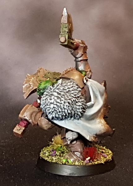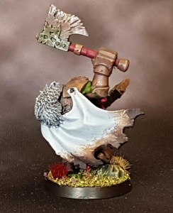 The hero’s cape is painted in three coats of Reaper Aircraft Grey and carefully drybrushed Reaper Leather White with a spot of Reaper Vampiric Skin. Then I sloppydrybrushed some brown (I honestely don’t remember which I used) followed by Reaper Dusky Skin Shadow and some black on the edges.
