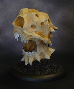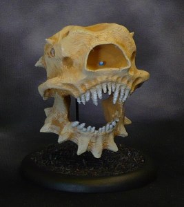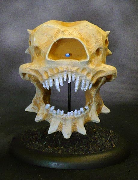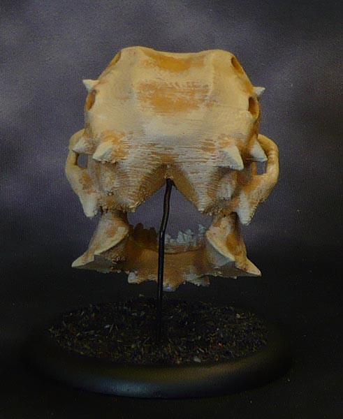 This is a really rough and ready five minute paint job, started out painting the whole thing skeleton bone, and then globbing some leather brown in all the recesses, and then going over with some more skeleton bone. Fangs in grey and lighter grey. Some dark blue, light blue and a dot of white on the central eye dot. (I am thinking of revisiting this and adding some OSL inside the eye socket.