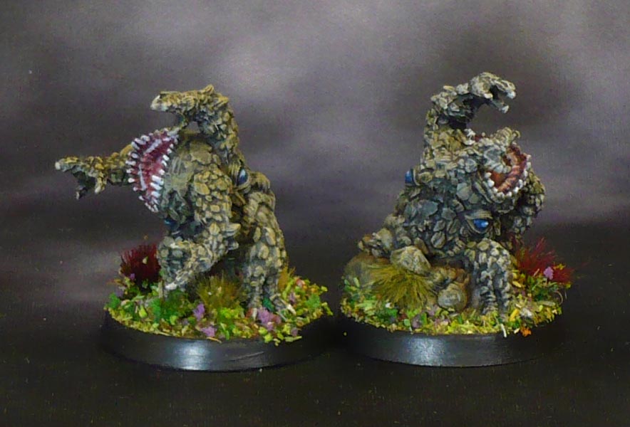 They come pre-primed, so I painted them by sloshing on some thin greenish grey, followed by drybrushing with sandy yellow and some bone white. I put some old citadel imperial purple in the maw, and slathered the things in dark tone quickshade ink. Well. maybe not slathered. I made sure to draw off most pooling before they dried up leaving those horrible tide marks.