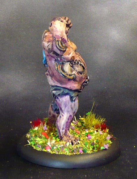 I painted the different parts in several distinct fleshtones, but the subsequent wash with Druuchi Violet and Athonian Camoshade evened out the colour significantly more than I expected. The purple seams I painstakingly painted in more or less dissappeared! The ripped pants started out dark blue green, but ended up dark brown.