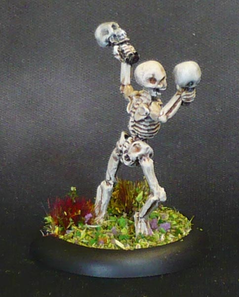 Very basic and quick paint job, the whole thing in yellowed bone over a grey undercoat, a wash of Citadel Reikland Fleshshade and when dry a few successive drybrushings of bone colours, ending with teeth done in Reaper Pure White. The Rattleheads were done in grey-based bone colours to offset it from the skeleton’s own head.
