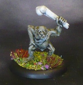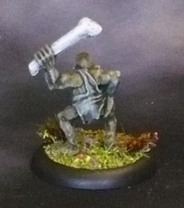 When dry (or rather, months later when I got around to continuing them) I did the loincloths in a variety of different colours, while doing all the metal weapons in black, metal, orange then drybrush metal and pale orange; the bones in offwhite, lanky hair and the few rocks in a few fitting colurs, and skulls in bone, and tongues in electric blue, all this done in assembly line-style as each mini just needed a little of each colour.