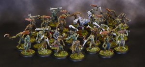 32 of the blighters including one earlier sculpt, collected from several different second hand sources in the course of the last year. Plus the later released Strigoi, nowadays known as a Ghoul King. The Strigoi was damaged, the lower jaw was broken off. I just painted in a couple of teeth. A couple of the ghouls had replacement weapons, and others had different types of damage or paint-residue gunking up the details here and there.