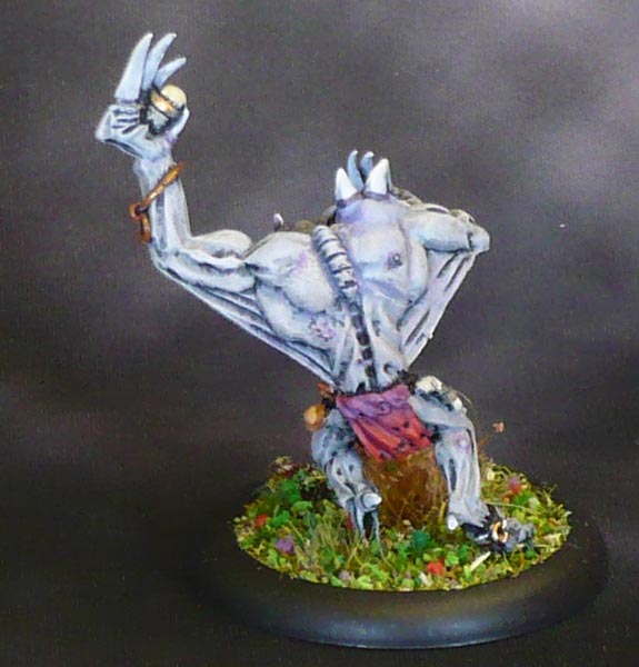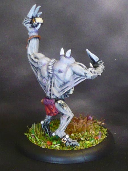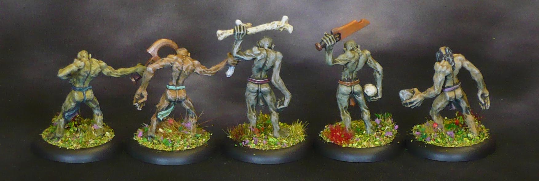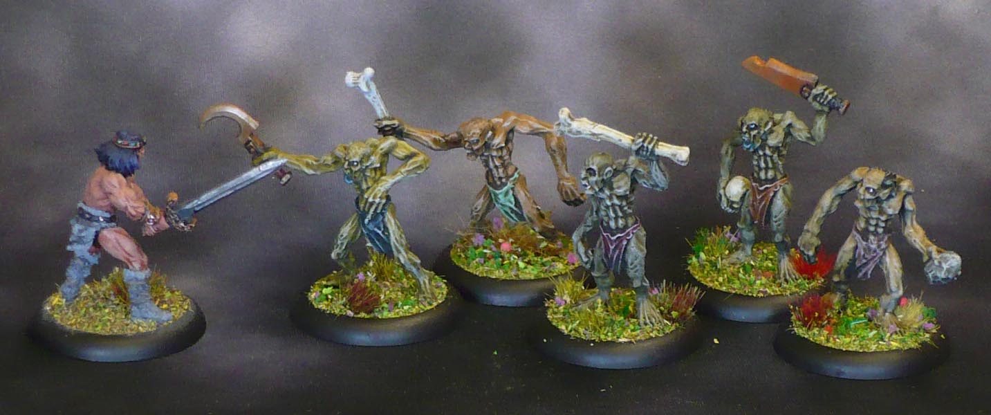 When dry (or rather, months later when I got around to continuing them) I did the loincloths in a variety of different colours, while doing all the metal weapons in black, metal, orange then drybrush metal and pale orange; the bones in offwhite, lanky hair and the few rocks in a few fitting colurs, and skulls in bone, and tongues in electric blue, all this done in assembly line-style as each mini just needed a little of each colour.