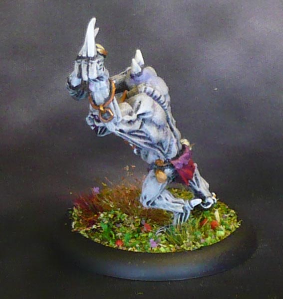 Then came wash of slightly thinned down Citadel Athonian Camoshade, the greenish brown one. When that was dry, I drybrushed very lightly with a light grey, and worked in addition a few of the colours up again here and there, such as all the bones. Black eyesockets with a single white dot makes for evil eyes. Also white teeth where present.