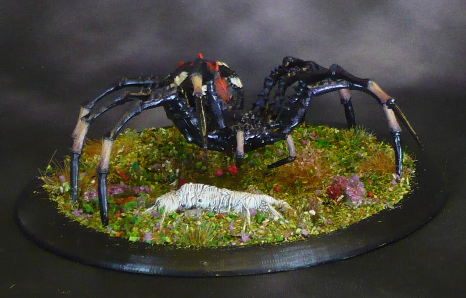 A metal miniature I traded for some time ago, this is the Monstrous Spider from Heresy Miniatures. I added a resin webbed-up victim which I had from ages past, I think it is from Grendel Producions. The base is 120mm x 90mm 3D-print. The metal Monstrous Spider went out of print several years ago, but a resin version, and also a resin/metal hybrid, and also a limited full metal version is intermittently available from Heresy Miniatures.com
