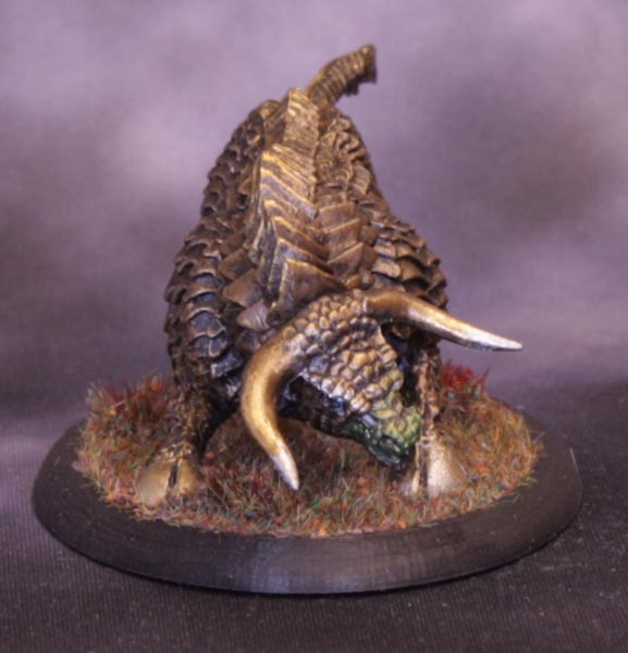 This was painted for an easy and quick finish. Starting with black undercoat, I drybrushed it heavily with Vallejo Tinny Tin, then lighter with Scalecolor Necro Gold, and more lighter with Vallejo Model Color Brass. A bit of Army Painter Shining Silver for the sharp bits on the horns and hooves, and very light highlighting here and there. All done with drybrushing. No washes, layering, wet blending or any other fancy-schmancy techniques used.