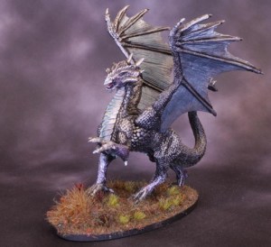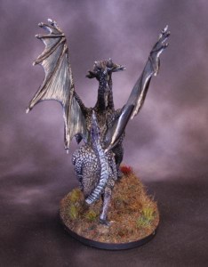 Black undercoat. Heavy drybrush with Scalecolor Black Metal, followed by successive lighter drybrushings with Army Painter Lead Belcher and Army Painter Shining Silver. Some Scalecolor Cobalt Alchemy gived the wings it’s blue tint, Shining Silver on the back half. Scalecolor Emerald Alchemy down the front for a greenish tint. Scalecolor Amethyst Alchemy here and there to add some interest. Instar Radiant Red metallic on the tongue. Instar Blue Purple Flip metallic on the eyes.