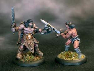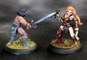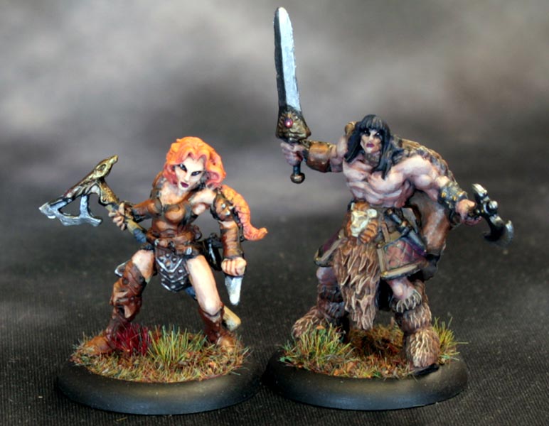 These are B4Core #95 Elf Female Barbarian, and B4Core #5 Human Male Barbarian (pinhead). Names to be determined, as they are as of yet unreleased.