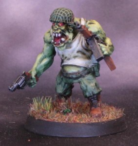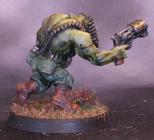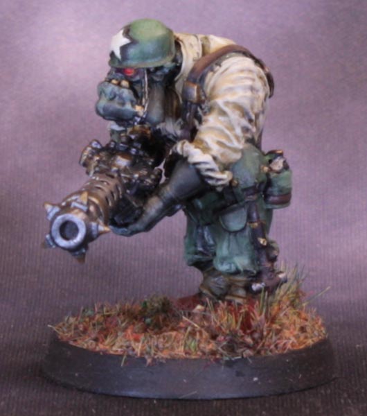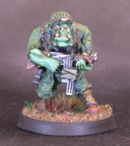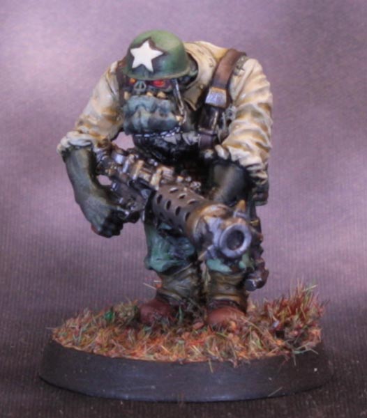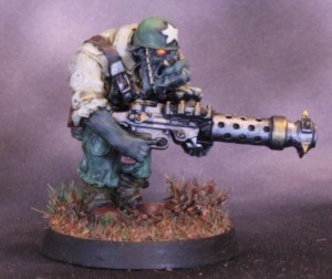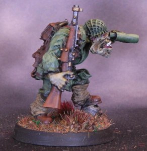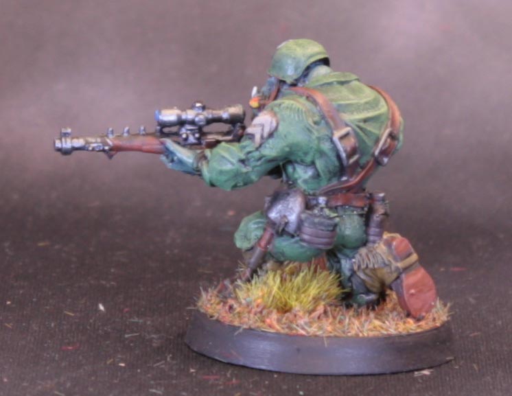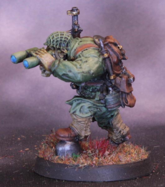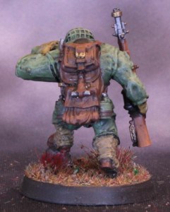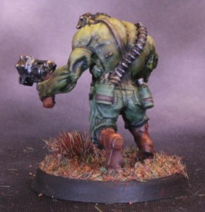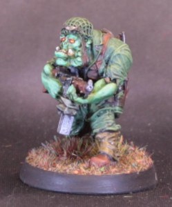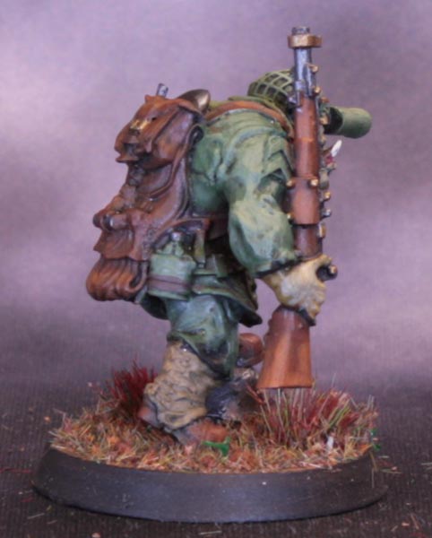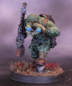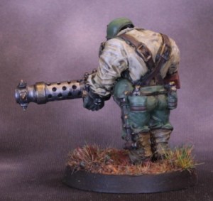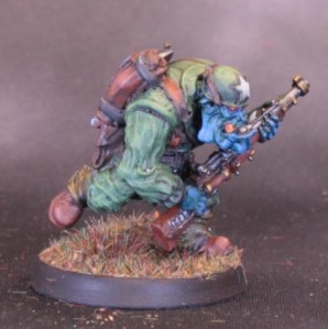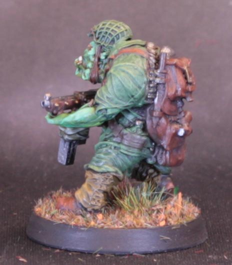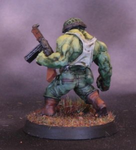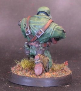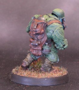 The minis were built when I got them, and the weapons do not always match the gear, such as here where he is armed with a submachine gun and has a machine gun magazine in his belt.
