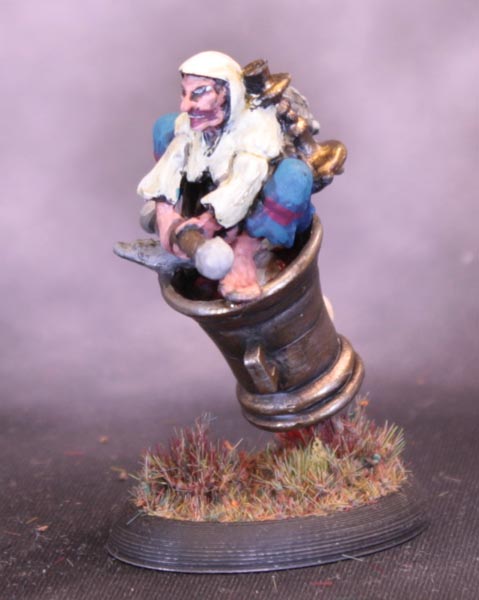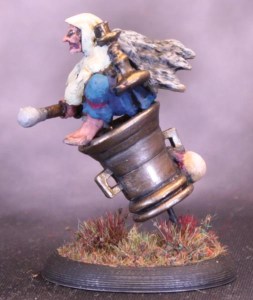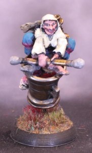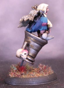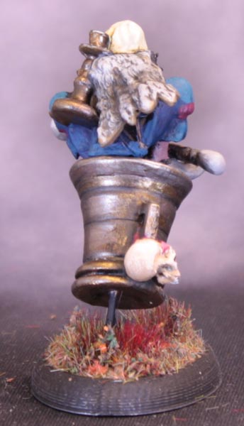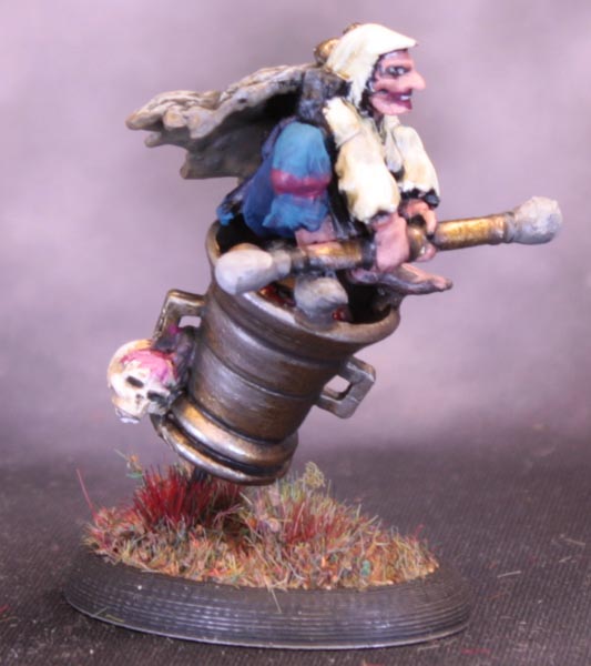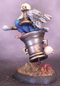 I made a 25x35mm oval base and drilled a hole in the bottom of the mortar. I unbent a paperclip slightly and bent the long bit at an angle, and glued the end in the hole. The rest of the paperclip was glued flat on the base and lo! A flying mortar. I glued Baba Yaga herself down at an angle to make her looking more like she was sitting comfortably rather than squatting precariously. I am pleased with how the angles match up to make her look straight ahead.