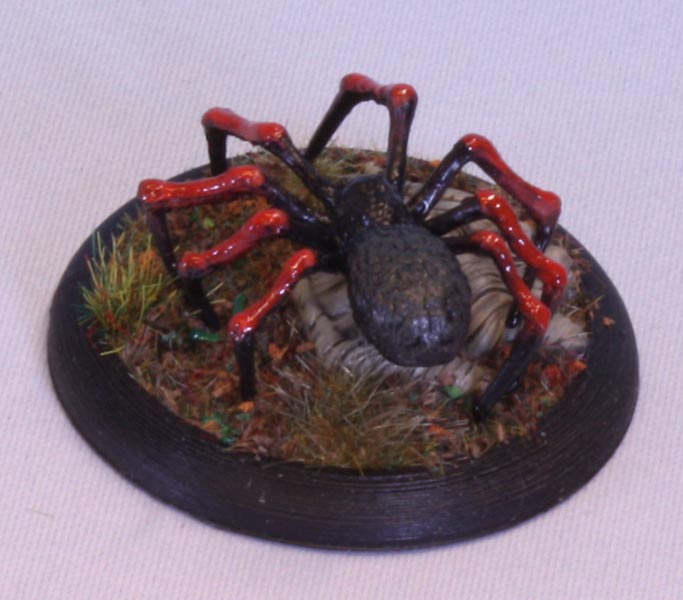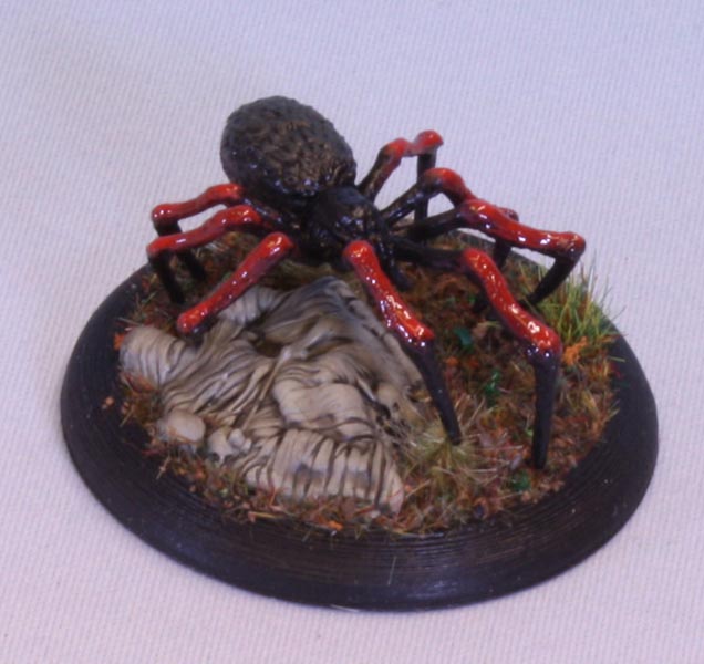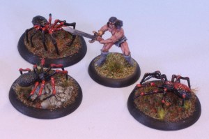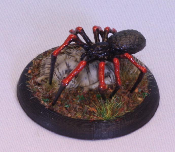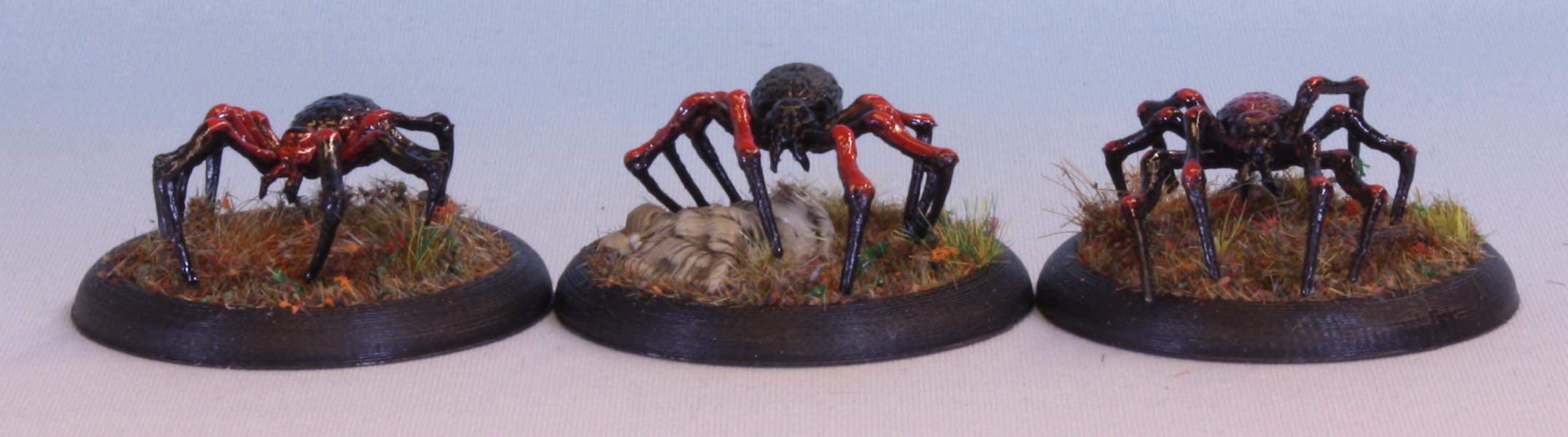 I made 40mm bases for them. One of the spiders came with a webbed victim-piece, which can be seen above.