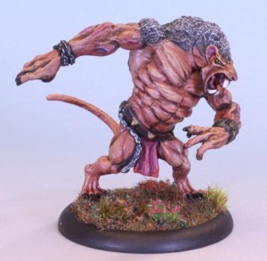 I have been away and had alot to do at work ever since, so no painting has gotten done for some time now. I did however manage to make some time today, and have painted up the Rat Ogre from the Bones 4 Core set. Oh, sorry “Giant Wererat”.