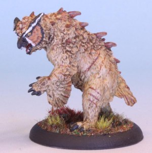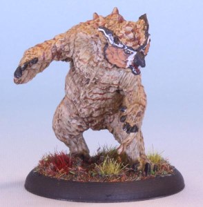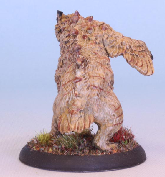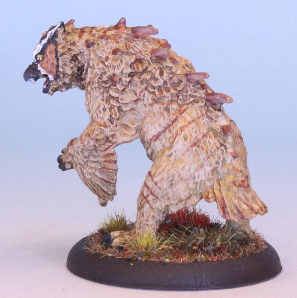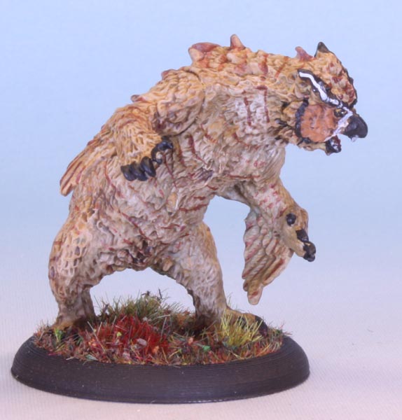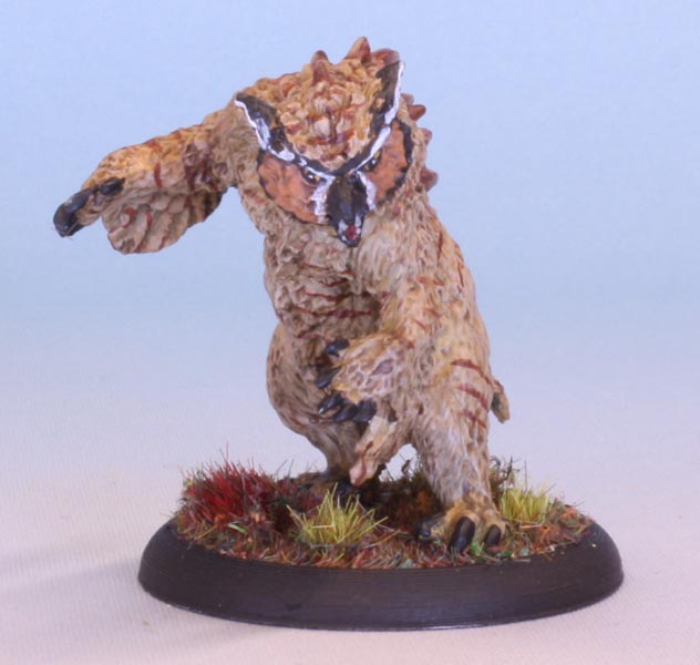 So I painted it as a Great Horned Owl’s fledgling, which in general are lighter in colouration until their chick-down falls off during moulting. I have some larger owlbears that will be this one’s parents. When I get around to painting them that is.