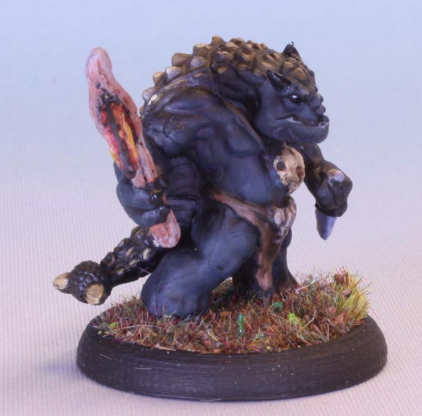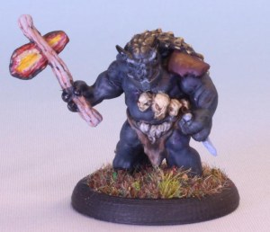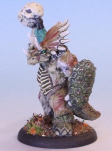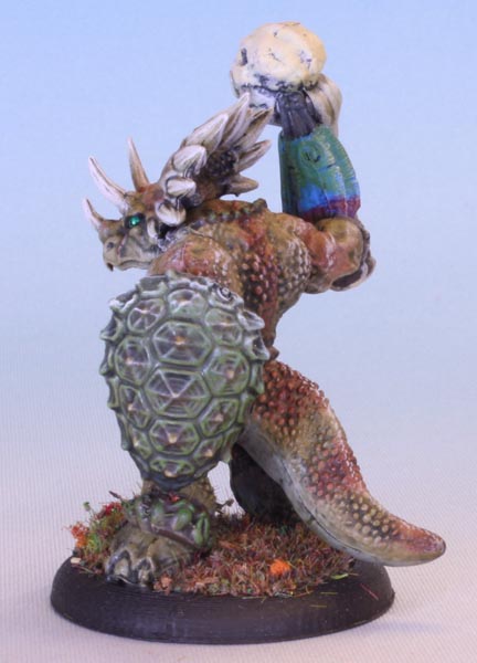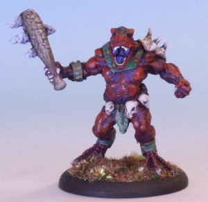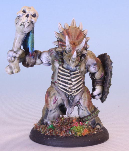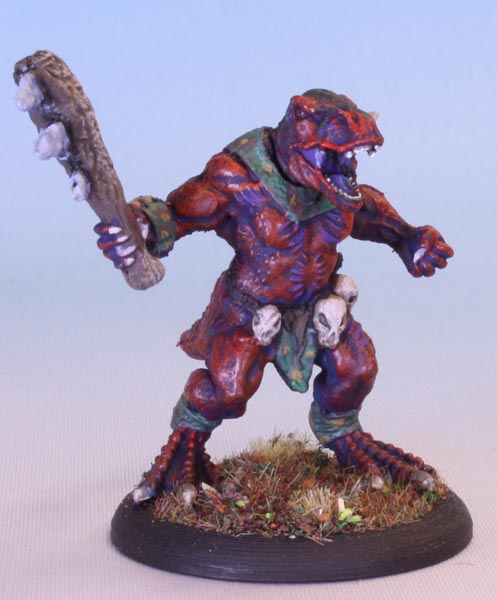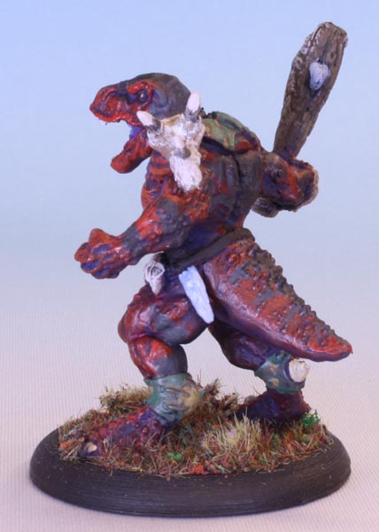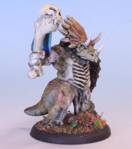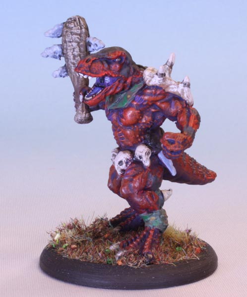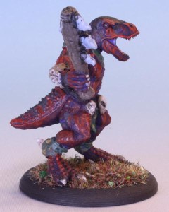 Tyrannosaurman! Painted in mostly the same scheme as the T-Rex-lookalike Blacktooth Terror. Black and red being markers for “evil”. He likes to wear thunderfoot skulls as pauldrons.