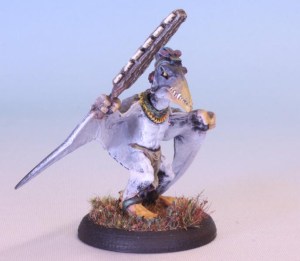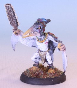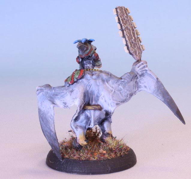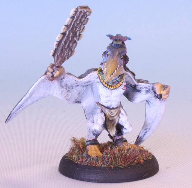 Pteranodonman! I modelled the paint scheme after a seagull. This one has a South American Prehispanic vibe going on. Probably on account of the headdress. Not the macahuitl at all. No sirree Bob!