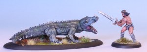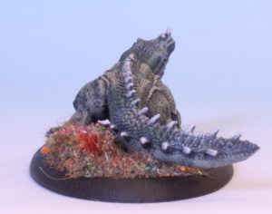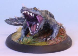 Painting beasts such as this is a doddle: black undercoat, heavy dark blue drybrush, then some darkish greenish ochre and assorted sandy, green, and some pale blue grey. Pale belly and undersides. Claws and teeth in offwhite. I did some electric blue dots on the face just to get some colour in. This is mostly a case of throwing some colour on here and there to hint of stripes or patterns in the hide, and then to just stop at some point. A very light dusty drybrush to unify a bit and done. Dark purply red and pink in the mouth.