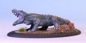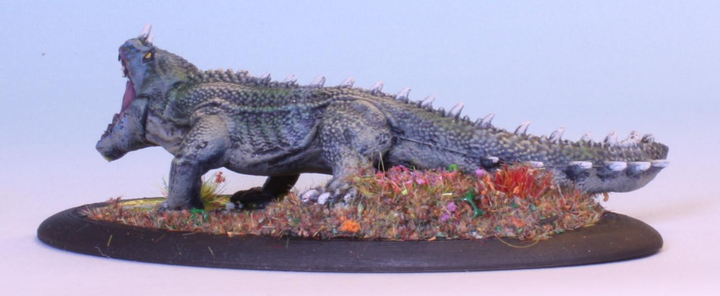 I based it similarily to the Enormous Crocodile I did some weeks ago, with a thin, oval base that was half “muddy waters” going the length of the body. 100x50mm 3D printed base, built up to the left hindquarters with some scraps of plastic and putty.