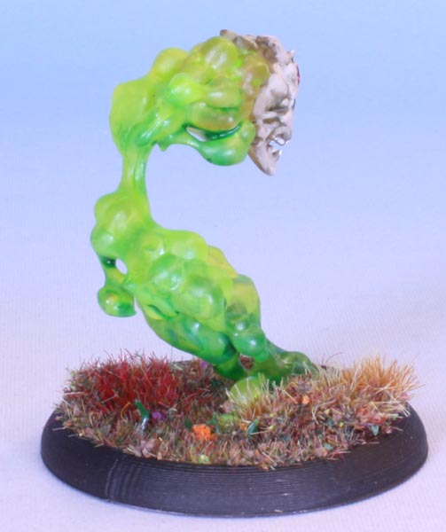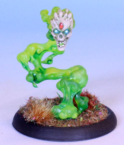 A simple paint job, I used Citadel Tesseract Glow on the top and Vallejo Black Green ink on the bottom half, avoiding too much pooling. I tried using different contrast paints on the skull, but they did not work at all over the clear parts. I painted over with several bone colours, some blue and red for the eyes and jewel, and added a light wash of strong quickshade around the edges.