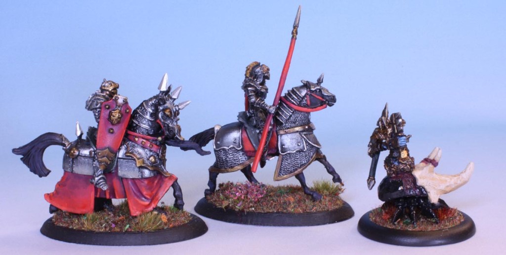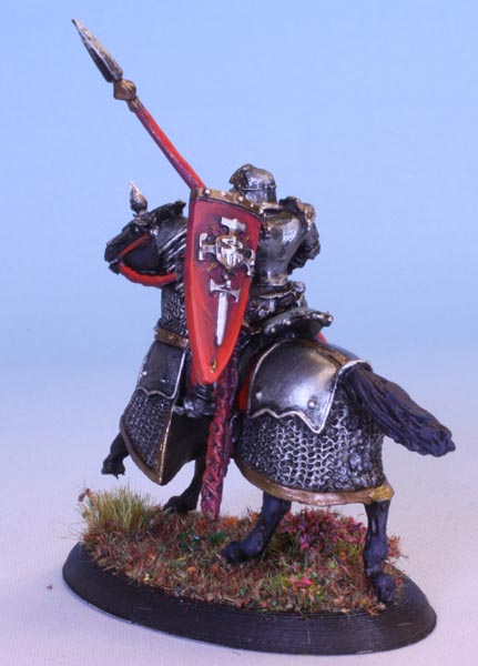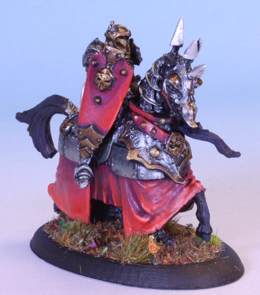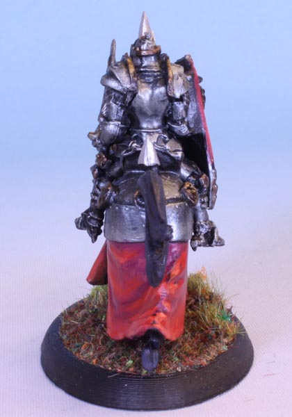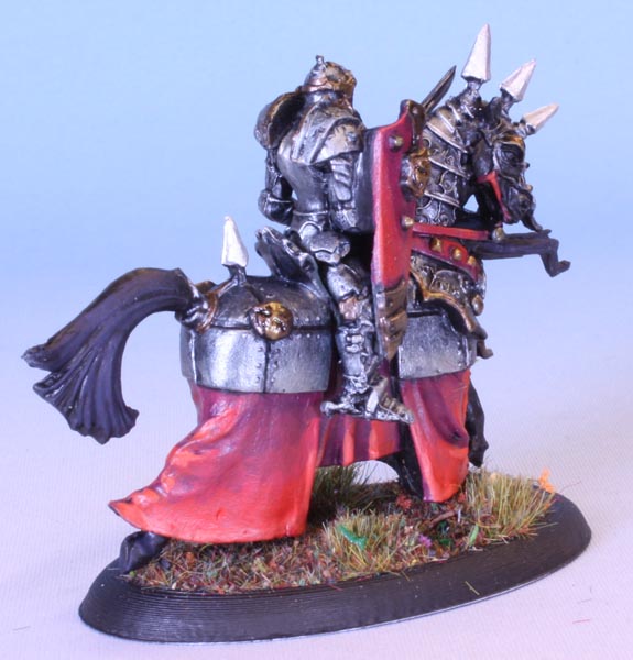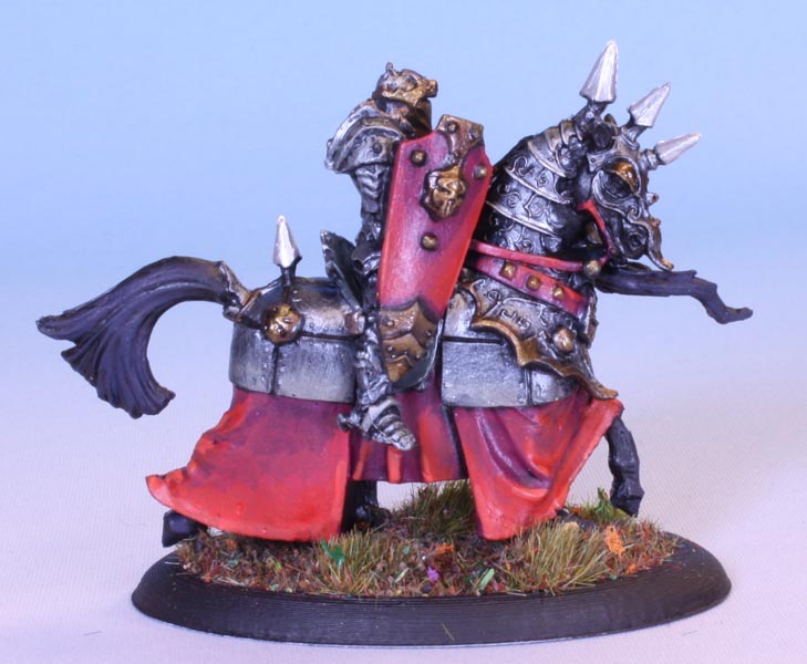 Bedecked in spikes and skulls, the hallmark of an evil knight. So, Red, black and dark metals to emphasize this.