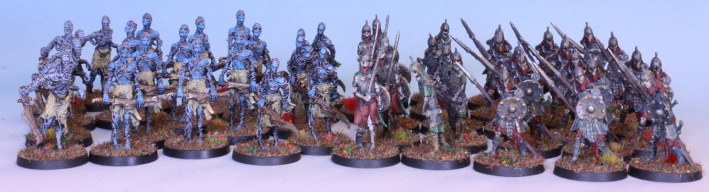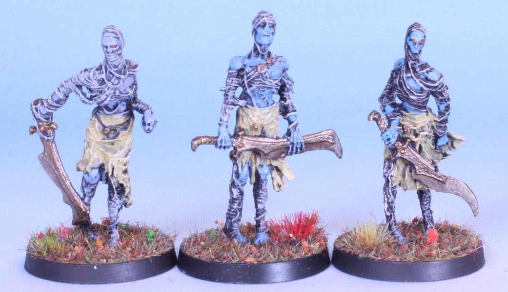 These are mummies. Or Draugr if you will. Maybe they could pass as Zombies, or elites such as Grave Guard, Barrow Wights or similar. They do have some flesh on them, even though they seem rather dry. No armour to speak of, and massive curved cleavers, the (over)size of the weapons traditionally indicating the danger level they pose. And these weapons are really quite big.