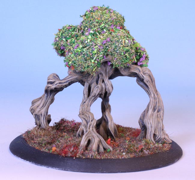 This treeman is a bit mangrovy. The wood is painted a few different shades of brown and yellowbrown on a black base. I painted the foliage green and used my spring/summer flockmix for that, and used tufts and my autumnal flockmix on the base for contrast.
