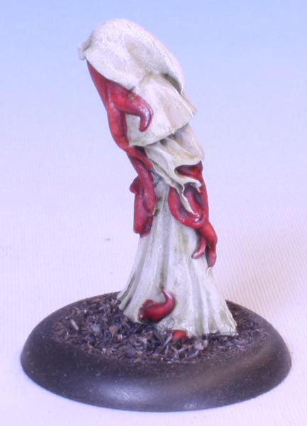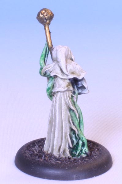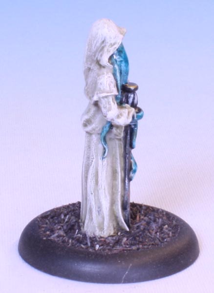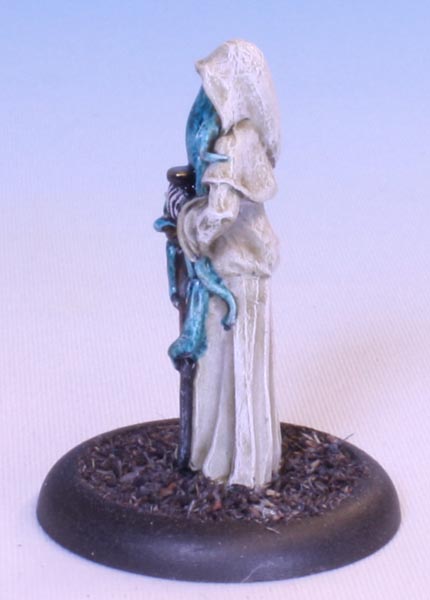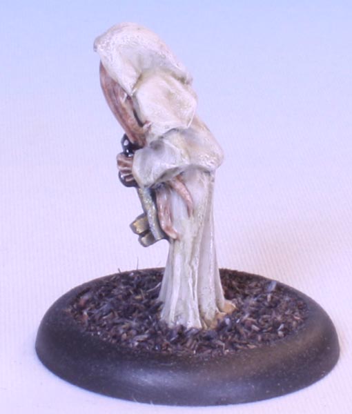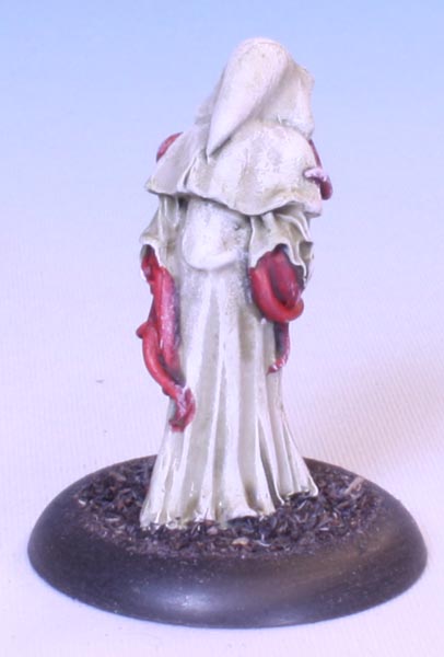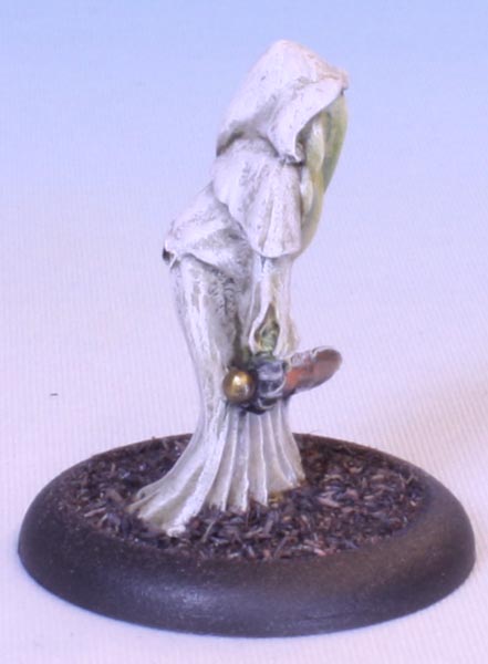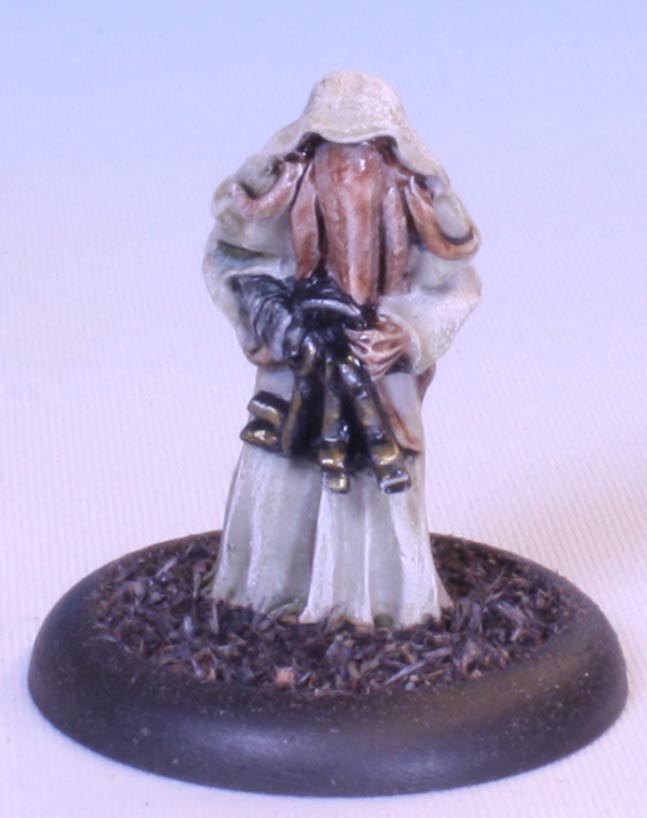 I started from a black/grey zenithal undercoat and painted all the robes with a brown-grey-beigeish color called “Iron” from an old paint range by Hobby Games Products, later I drybrushed with Reaper Vampiric Shadow, then Reaper Vampiric Highlight. After all this was dry, a coat of Citadel Athonian Camoshade, re-brushing over the models with a damp soft brush to suck up pools and take some tint off the high bits. When this was dry, a very careful drybrush with the two vampiric colours finish the cloth. (They seem to be slightly washed out in the pictures, the cloth looks really good to my eyes IRL.)