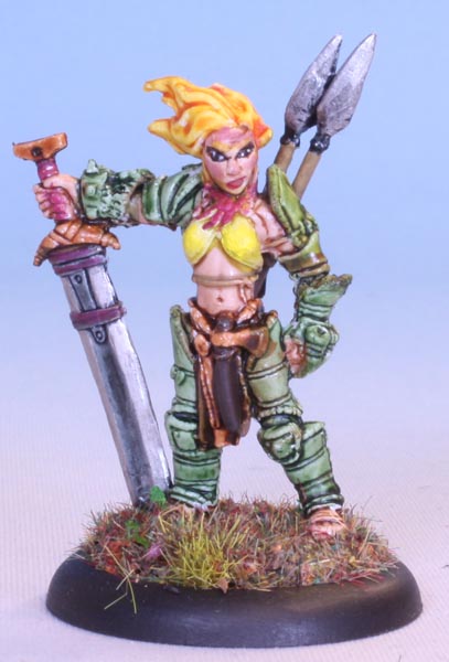 The “Iconics” pathfinder minis often have cartoony weapons. Yet again here we have a female with armoured extremities but a bare midriff. Those uncultured barbarians really don’t understand the point of armour do they?