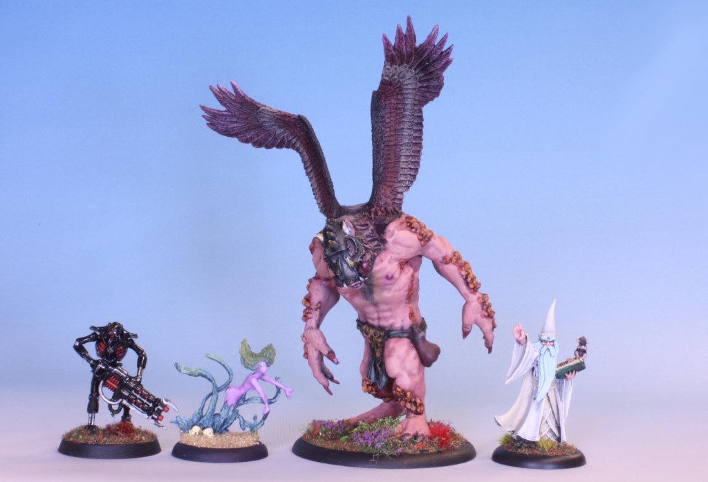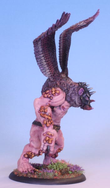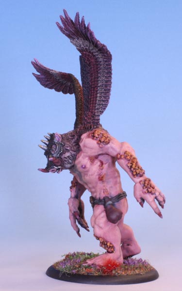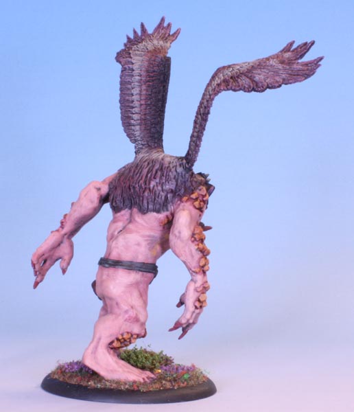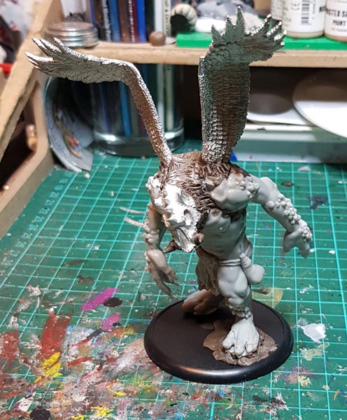 I drilled out holes and inserted a pair of metal wings I had lying about in my box of ancient bits. they originally came from a Warhammer Wood Elf Warhawk rider model that was missing some part. Ditto the head, that came off an Orc Warlord’s Warboar. Some drilling and pinning later, when the glue had set I went at it with some brown stuff. this is similar to green stuff, only it is brown (duh), softer when mixed and can hold a sharper edge than green stuff. More importantly, I have a roll of it.
